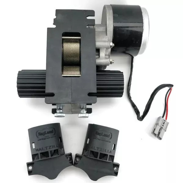 Ima ugrađeni motor od 24 V, koji je dovoljno snažan da lako zdrobi zrno slada. Neki proizvođači mlinova izrađuju mlinove od čelika. Drugi visokokvalitetni mlinovi kaliraju čelik kako bi zubi ostali oštri i nastavili privlačiti zrno. Neki drugi proizvođači pokušavaju riješiti taj problem upotrebom nazubljenih valjaka, kako bi se zrno bolje uhvatilo, ili upotrebom 3 valjka, gdje prva dva valjka s većim razmakom gurnu zrno u treći valjak. Po našem mišljenju, te opcije ne rješavaju stvarni problem tuposti čeličnih valjaka, osobito pri drobljenju tvrdih zrna. MaltZilla diamond mlin ima potpuno drugačiji dizajn i prvi je na svijetu koji koristi dijamante impregnirane u površinu valjaka. Čak i nakon prerade mnogo tona zrna u mlinu, ti dijamanti ostaju oštri kao prvog dana.